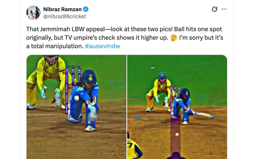 मैच के बाद एक ट्वीट वायरल हुआ जिसमें दो तस्वीरें दिखाई गईं — दोनों में जेमिमा रोड्रिग्स LBW अपील के दौरान नजर आ रही थीं।